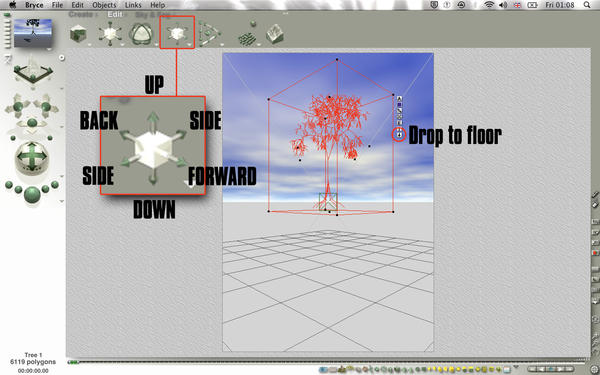 You can also select an oject and move it back, forward, left and right using the arrow buttons on your keyboard. Each click will move the object a set number of Bryce units. If you want to move it in finer increments, use the 'option' modifier in conjunction with the arrow buttons on your keyboard.
