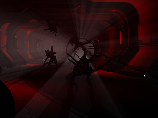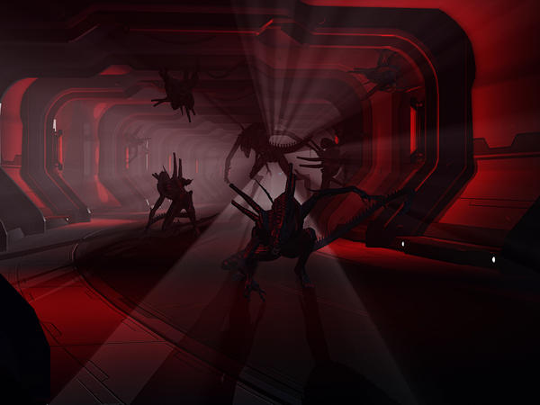 You might also consider bringing the camera in a bit closer, fill the image with the aliens and less with the open space of the corridor. That's just a personal preference, so take it or leave.