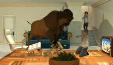 1A - How did they end up with a buffalo as a pet in the first place???? I mean, if you assume buffalo as a pet, I guess letting him jump table in the basement isn't so surprising.
