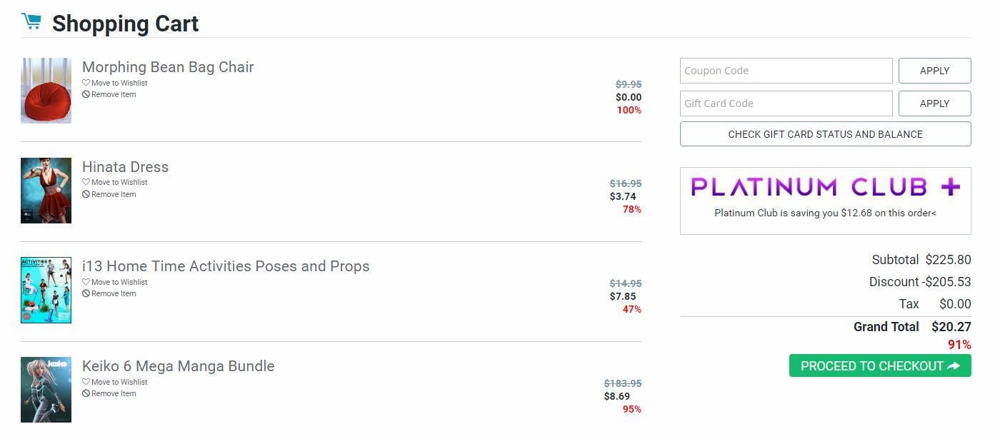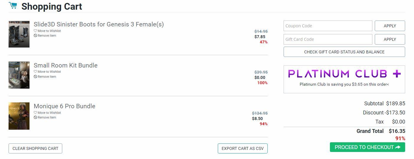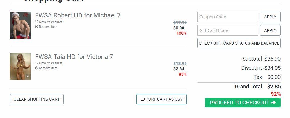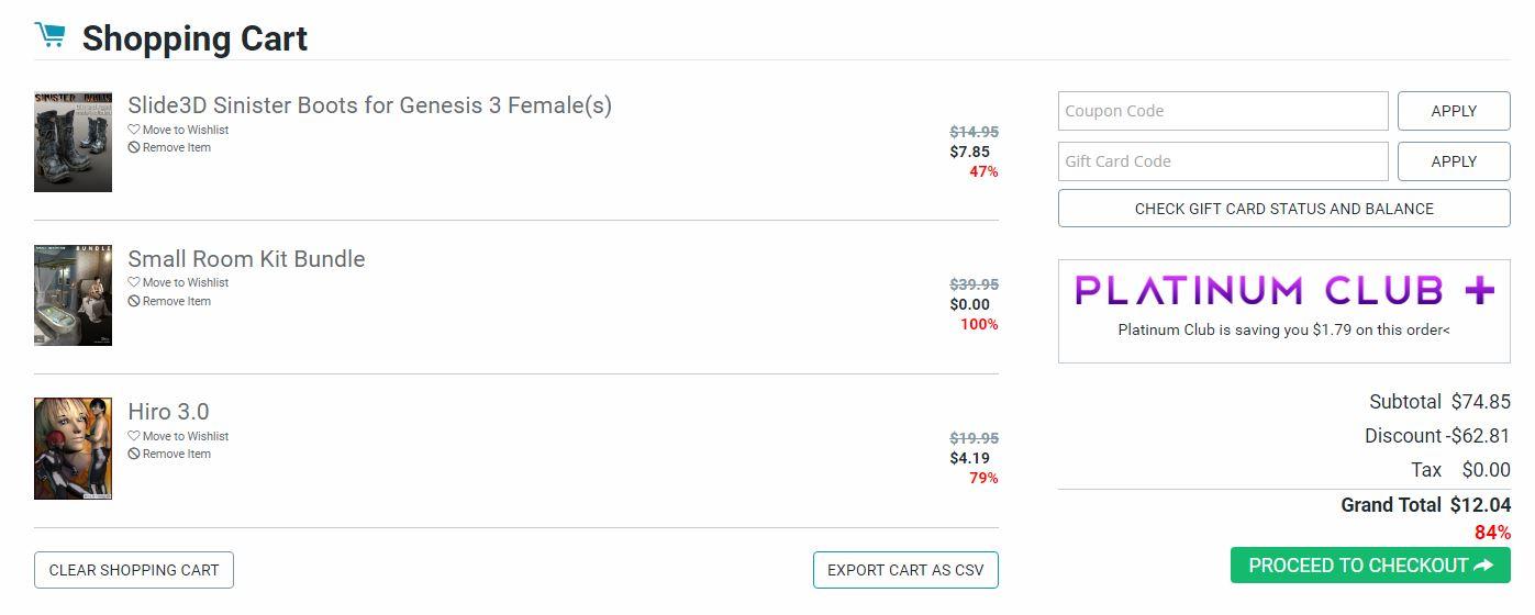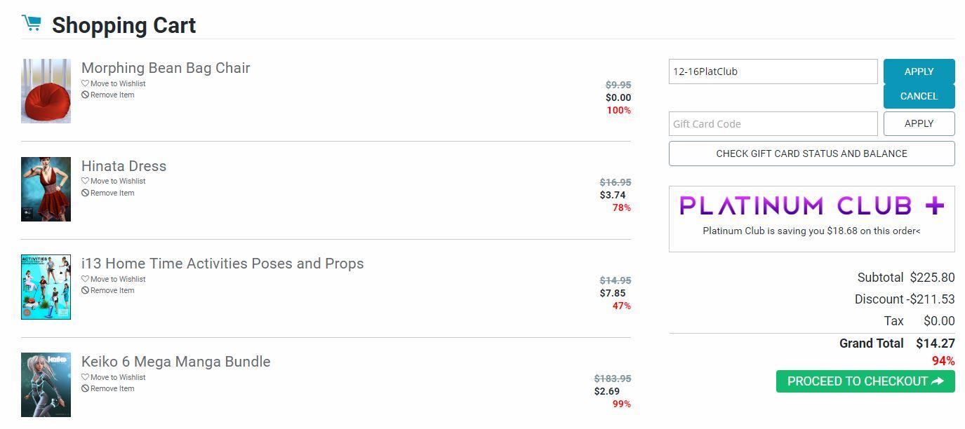 Then I got an orange banner with yet another discount... Which explains why my cart went down when I refreshed it following Daz Midnight, (to see if anything went up in price at the changeover.) I average $3.47 per item in my cart. Not bad.