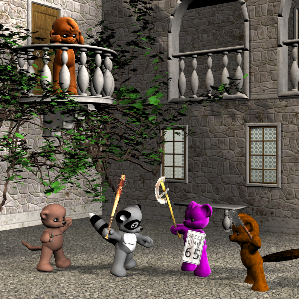 My plushie army is training. All in render from the RDNA migration. Used the toon courtyard and scavenged, junkyard weapons.