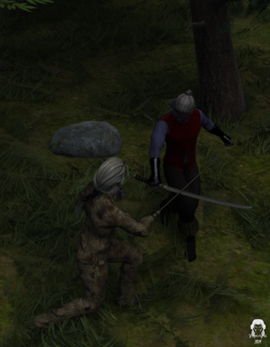 I start awake to the touch of cold steel to my neck. "Make a move for a weapon and I'll slice your neck." the shadowy shape before me says. I did not understand the language this was spoken in but the meaning seemed clear from the tone. The words seemed a odd mixture of low elvish some dwarven with another added in, all spoken in a odd accent. I must have dozed to have allowed this man to get this close to me. The last two days had pushed me to exhaustion. I slowly raise my hands and try pure elvish. "I meant no harm, can you understand me? Please sir I can't understand you," I say. In a very good elvish he replies with the blade still to my neck, "Yes I can, now look to your right before you decide this old man is no match for you. That young lad with the arrow pointed your way is my son. I can assure you he will kill you long before you harm me if you try." I simply nod. From the left the largest person I had ever seen steps into my view, this giant gathers my swords and then relieves me of my other weapons as well.