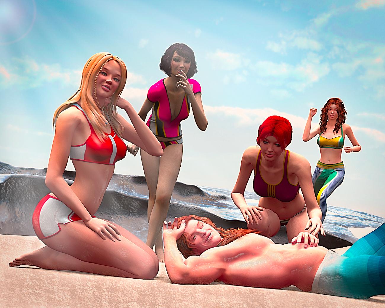"Hurry, administer mouth to mouth! He's the only other person on this deserted island, other than us, the all female volleyball team for our College of Fashion Models.  And the only parts of our jet that survived the crash last week are the fully stocked bar and a freezer full of steaks and prime ribs."