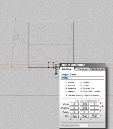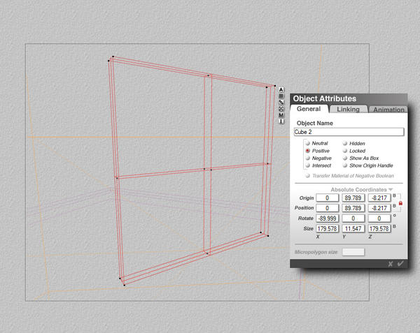 Image 1 shows a cube, flattened with attributes "Positive" selected. This is important since we are going to cut away the substance of this block to leave the shape we are looking for. A brick pattern is object space mapped on to it. So in that sense it is like your main wall.