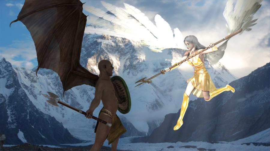 Posing seems to be the hardest part. I tried to move the angel, closer, and execute a simple pivot to swing the axe. Apparently, I moved her too far, because she's totally blurred out. I tried adding a couple keyframes to have the final position weighted more than the blurred out section.