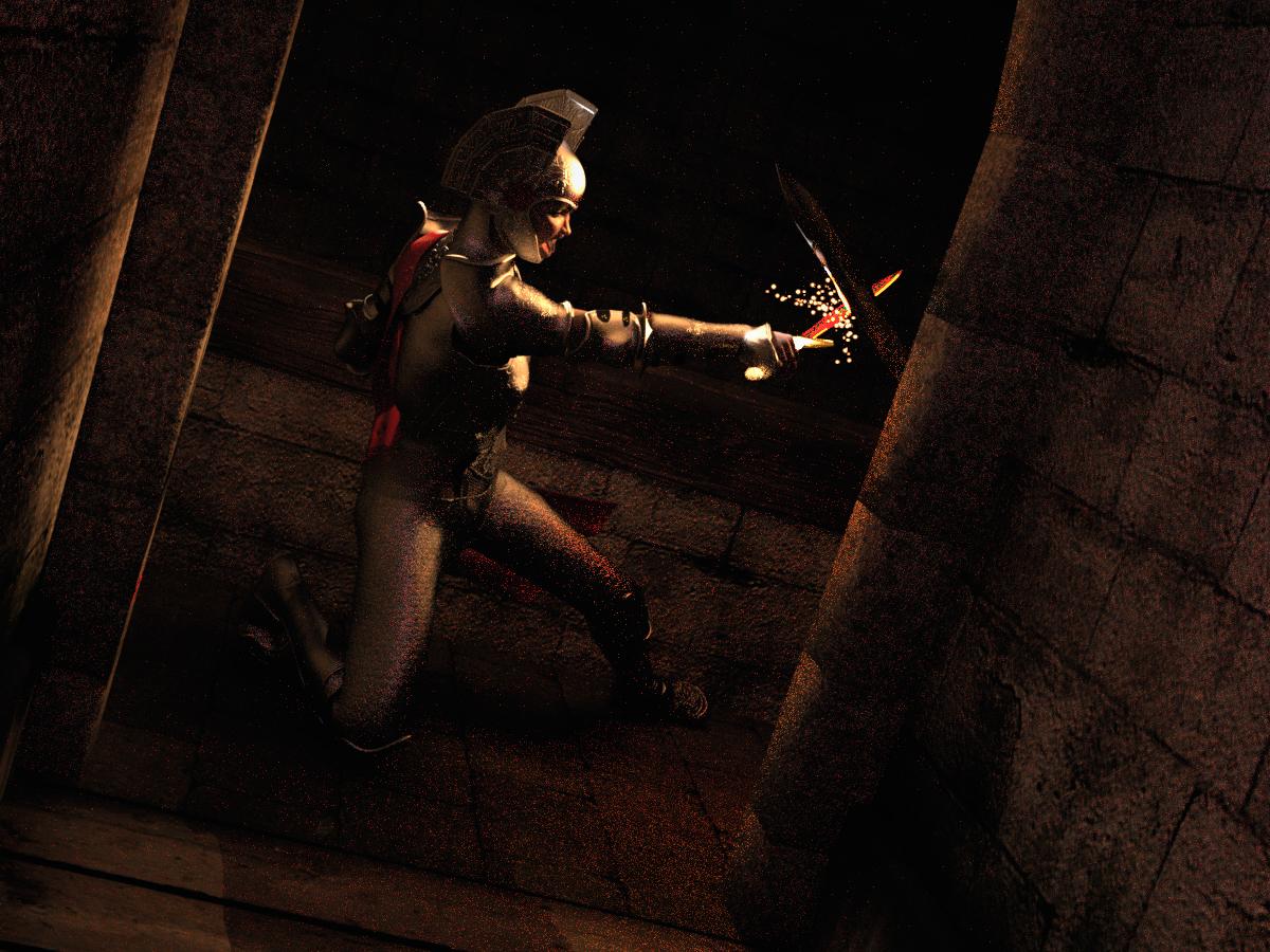 There is so much warmth in the lighting, try adding a little cool. She is bathed by the warm light of her magic sword - how about adding a little green light behind the wall with a linear point light. The effect could give a spooky ambiance to your green sword opponent.