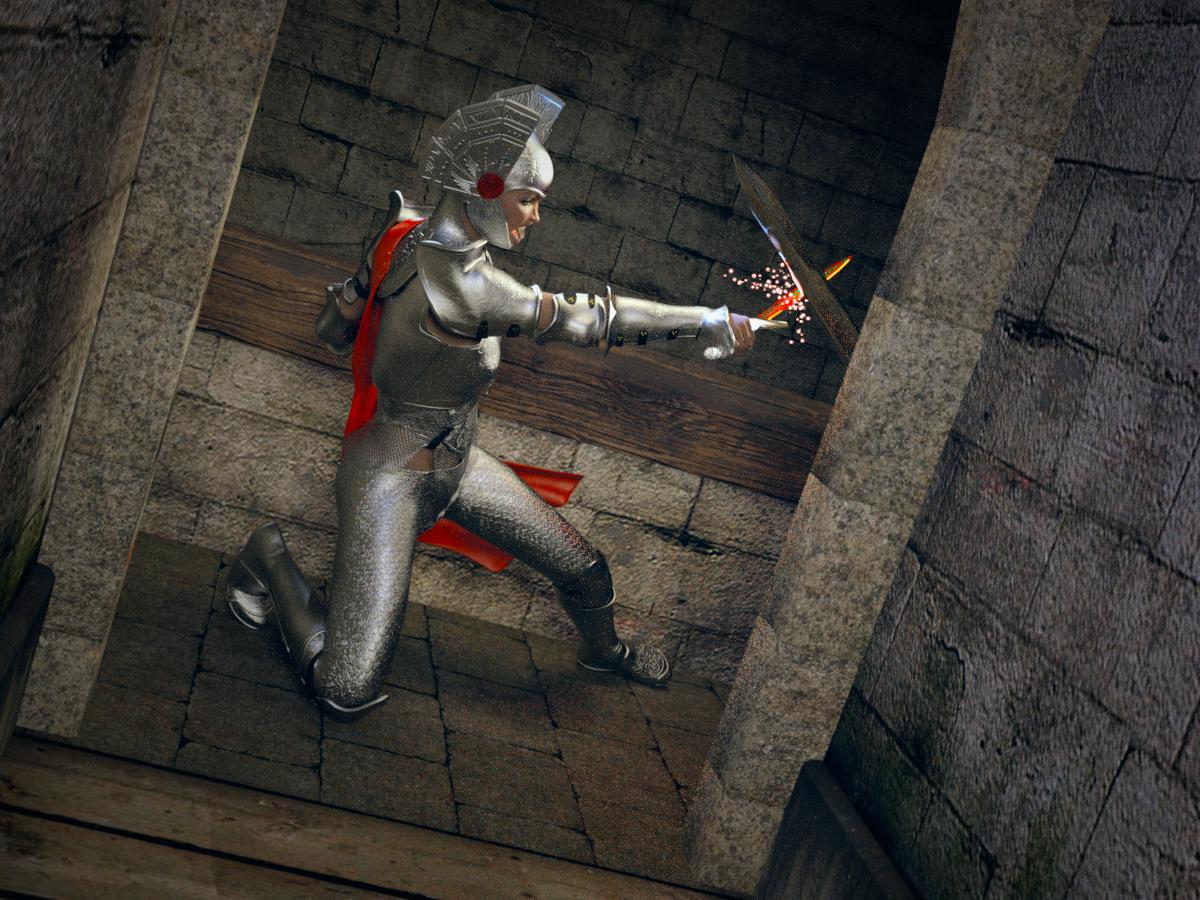 Jack, that is a great render and I like the changes you have made so far. There are some really good points in what Dracorn mentioned. Question at hand is what will your story be? Is she going to be defeated? Make her more defensive: bent the forarem with the sword so the agressors blade is only short distance from her face, make her lean back further so she is about to loose balance.