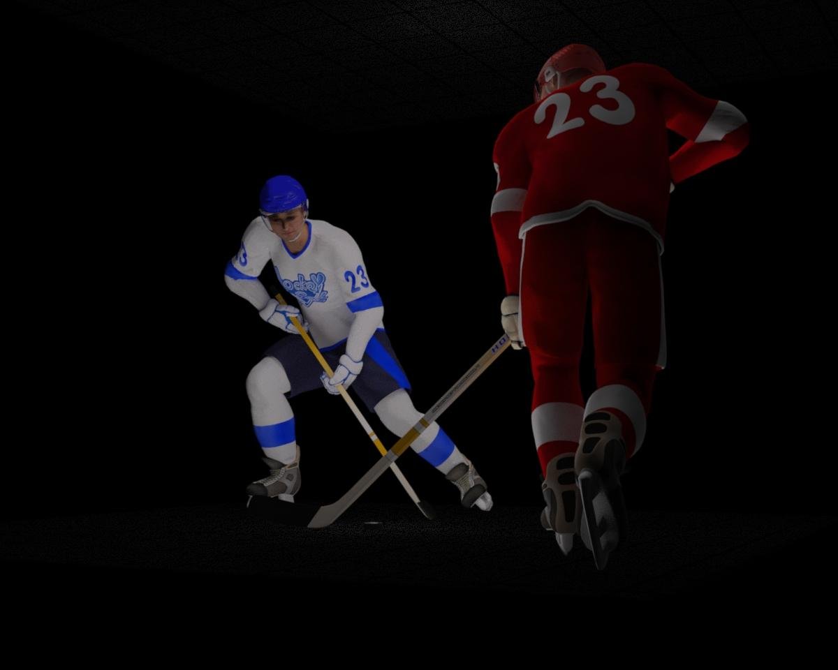 So, I finally got my act together since I finally figured out what I wanted to do.  Action isn't exactly my thing.  However, I have a friend who likes hockey and it's the middle of all the playoff games, here and over on his side of the pond.  So, I thought a little hockey action was in order since I actually have some hockey gear for M4 and stuff.  This is just the basic setup with some temporary mesh lights and blacked out background.  I found a free hockey rink that I managed to get into DS, but I'm still working on all of the surfaces.  I'm, also, working on doing some custom texturing for the hockey uniforms.  Right now, they just have the default textures that came with the pack.  I can't do too much with the textures until my friend sees this image so I can pick his brain about any favorite players' numbers and what the proper uniform color is as I found two different colors and I'm not sure which one is the right one for his team for the first guy.  The other guy will be sporting my team's colors.  Although, it remains to be seen if my player will be sporting the US uniform for the World Championship or if I go for my favorite US team who is currently still in it for the Stanley Cup.  I guess that depends on whether or not they beat Tampa on Monday.  We'll see if I can pull it off!