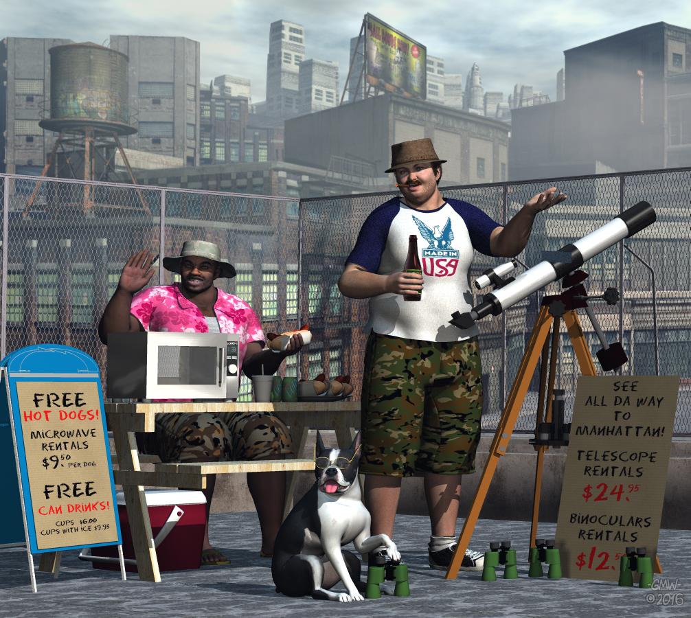 What are they doing down in the valley or on the next hill over...what? Next hill? Waddaya talkin' about? I'm livin' in Brooklyn...we ain't got no no hills. Even da ones in Central Park ain't all big enough t' look inta da next valley...even if we did have a valley! Now, buildin's, we gots buildin's! Lots of 'em! Miles 'n' miles of 'em. From a rooftop in my neighborhood you gonna see what people is doin' in dere buildin' an' it may not be sumptin' polite, so youse better not bring da kids 'cause udderwise dey just might be gittin' an early education, if youse knows what I means...But, hey! If youse wants t' see over inta Manhattan, we gots da place for you! Me 'n' Big Eddie Mac, we sets up an observation deck on the top of my apartment buildin' , jus' like da one in da Empire States Buildin', weres you kin sees all da way inta da city an' who knows what you'll sees. Jus' remember, we aint responsible for any traumas or nuthin' like dat onna count of what you mights view usin' our equipments. An' afta' you gits done we gots refreshments available at our snacks bar. Hokay, so everybody line up...no shovin'...and gets youse'selves ready for da thrill of a lifetime!