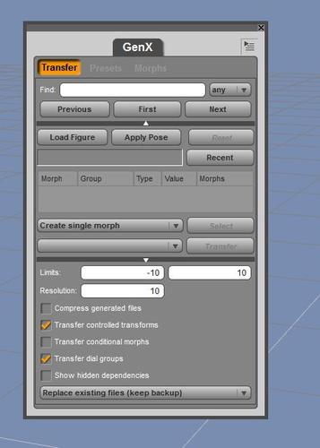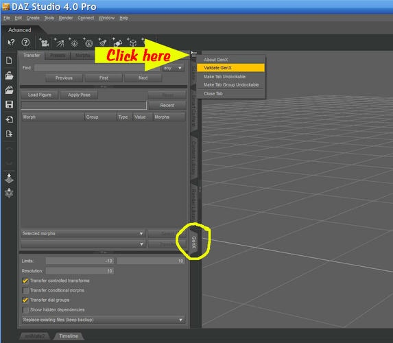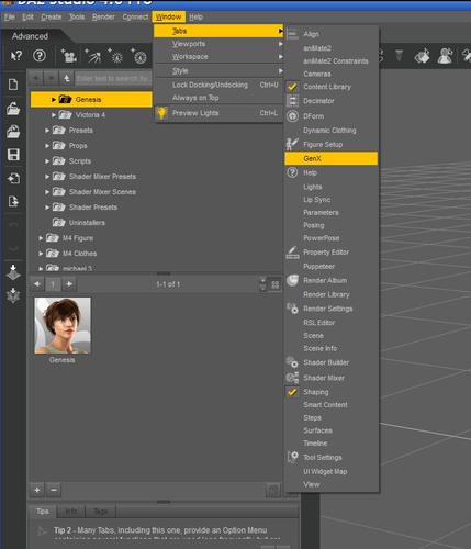 I even tried Studio3 but neither work. I open D/S expecting a dialog box to appear asking for my Gen X serial number. Nothing. I try and transfer morphs from Gen 4 figures to Genesis, hoping my new plug-in would be forced to start. Nothing. Uninstalled it and re-installed Gen X. Nothing. I looked in every tab available in D/S and didn't see my new plug-in. Nothing!