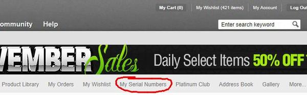 Log in, go to "My Account" and across the top bar, look for "My Serial Numbers"