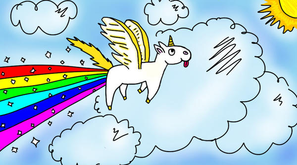 For Cjreynolds, I offer this image I picked off the internet. To answer an argument about how Unicorns fly. Since Unicorns are not real, their wings are not real either, so they cannot generate lift in ordinary "real" air - the wings must be just be for show. The answer I discovered was rocket power. (And this also explains where rainbows come from - see image). Rainbows, also, are clearly not real. Given the "output" of the Unicorn shown in this technical diagram of one in flight - I also concluded that they must feed on fairies. Careful examination of the plate shows it to be a copy of an image from an early cave painting dating back to 40,000 BC and may well have provided the inspiration for Leonardo Dicaprio's helicopter sketches, basing the "aerial screw" on the mistaken belief that it was the rotation of the twisted horn that lifts the Unicorn into the air and that the rainbow is just an escape of exhaust gasses. It turned out though that it was all just a dream within a dream...