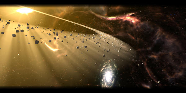 Your render also reminded me of the Voyager (Star Trek) opening theme – 1.08 minutes in), but as can be seen, it’s the density of the particles and ‘roids that is giving the band-like, ‘light’ effect. A recent image here accompanying research about asteroid belts turned up, too, but it pales really in comparison to yours (NASA needs to be hiring you :) ).