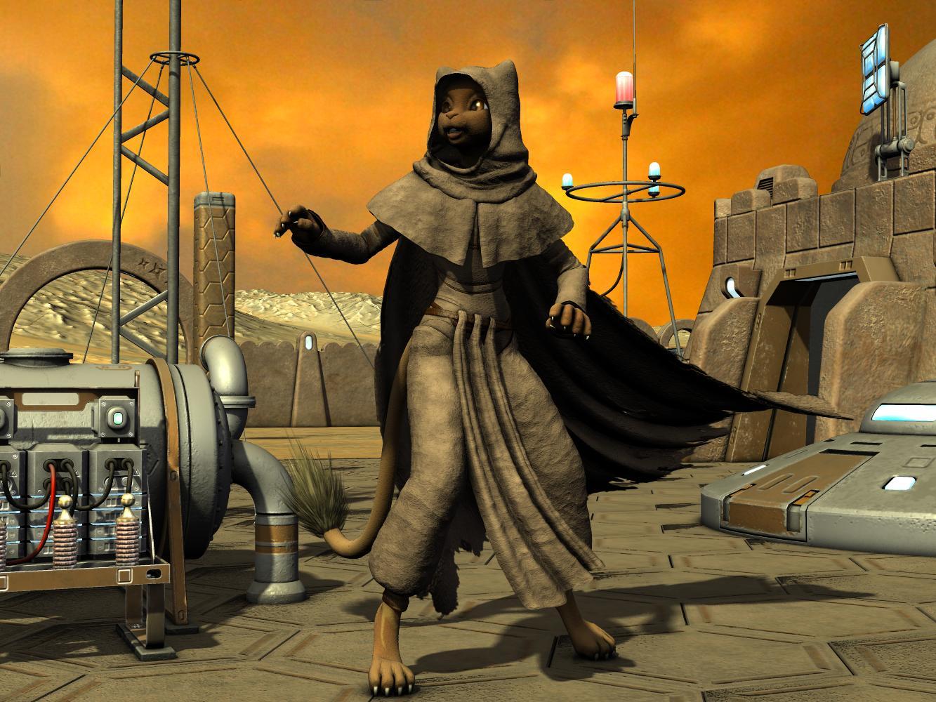 Creating a morph to suggest her ears "tent-poling" her cowl (from Shukky's "God of Death" freebie collection for A3) prompted me to dress Mzzkiti (using Melody for A3) in desert garb. Is she on Tatooine or Arrakis? Maybe she's in some arid environment within her own proper continuity. Meh, who gives a flying fudge?! Hmm...airborne brownies...is that a "thing", something that can be marketed? Why am I rambling?