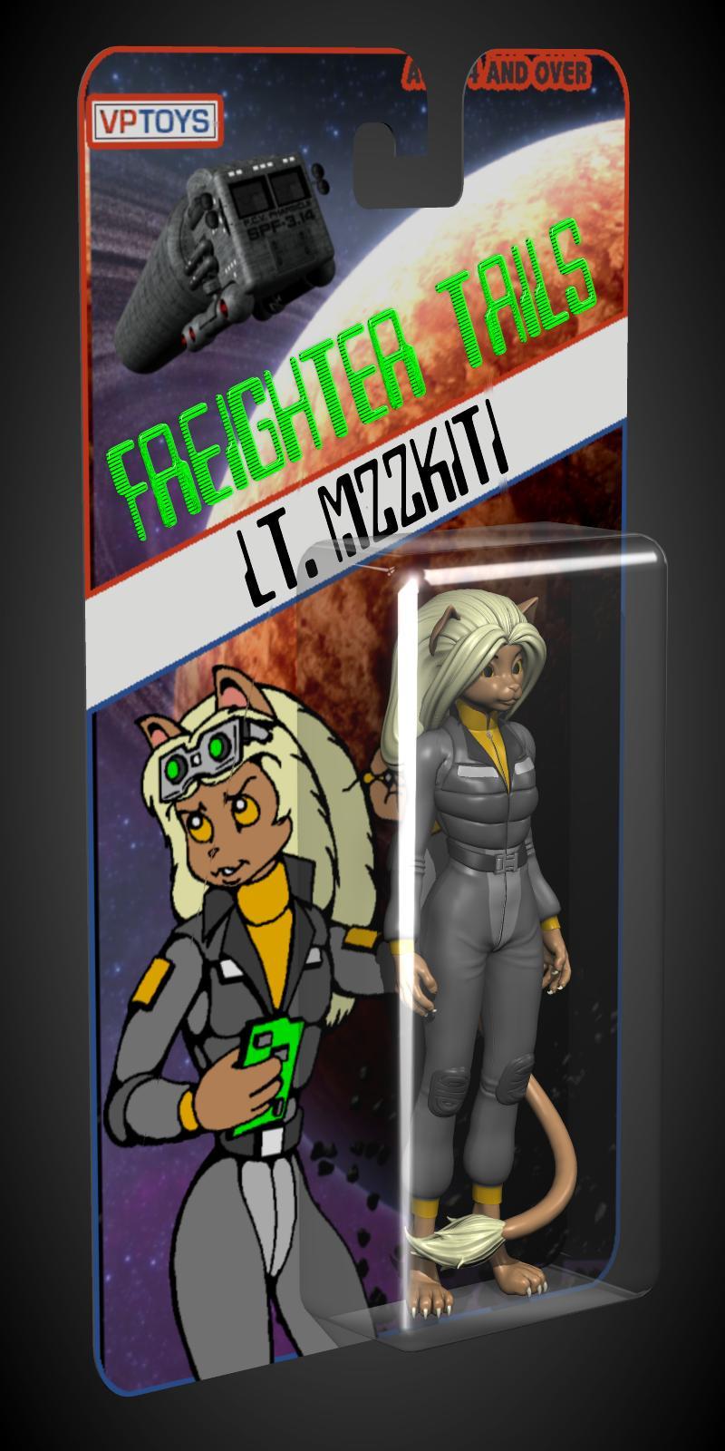 Aww...! You're too kind! Preparing the "figurine" was relatively straight forward. Remove all the textures and leave just the base diffuse colors with a bit of gloss. That and finding appropriate elements to depict "helmet" hair. I used props that came with MayaX's "Anime Doll Kit" from Renderosity and Poser "magnets" to reshape them. The more freewheeling aspect was coming up with a passable "backing card" design. Oh, that was one of the "blister packs" that came as part of a vintage freebie by MrSparky. I'm not sure how well it shows up, but the lettering for "FREIGHTER TAILS" is actually polygon modeling with chamfered edges, suggesting its part of the vacu-formed packaging. I used Hexagon's "text" tool to sculpt the letters.