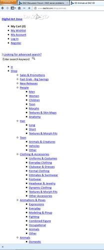 OK, tested with latest version of IE and it's exactly the same. The problem is simply not at my end. Forums work fine. If I click on the daz3d.com link in a search engine I get a sorry the page cannot be found page and then if I click on the homepage it loads OK. Something is messed up. I'll check back tomorrow.