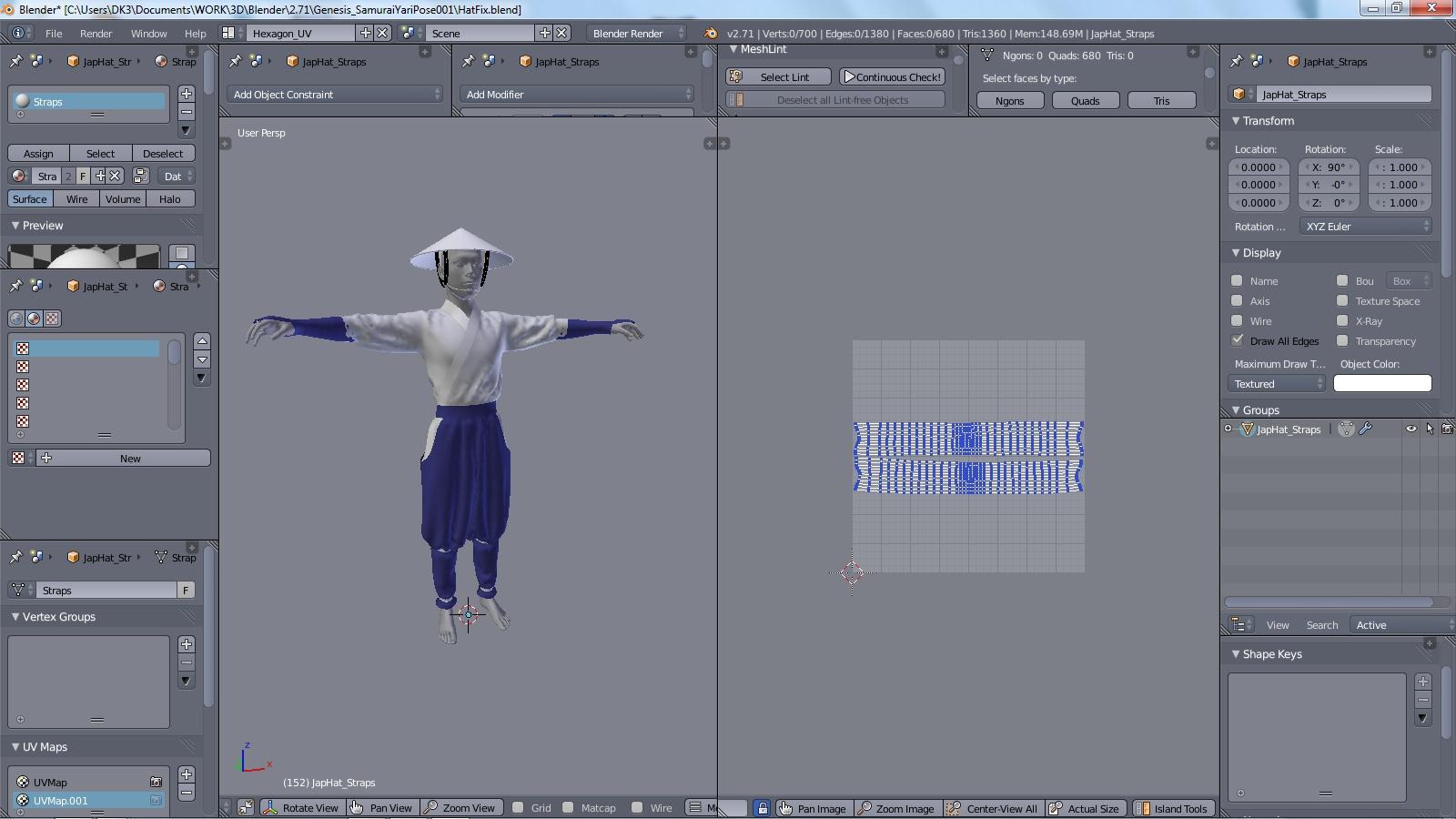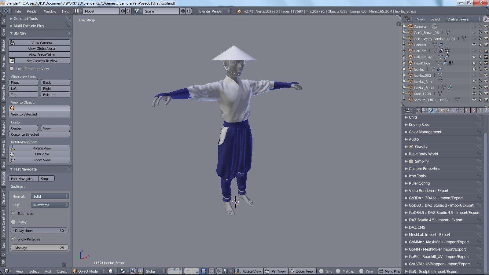 The outfit in my screencaps above was created in MD2, and the hat was created in Wings3D years ago for Poser4 Dork. I brought it into Blender for a Genesis upgrade for an NPR image I am working on.
