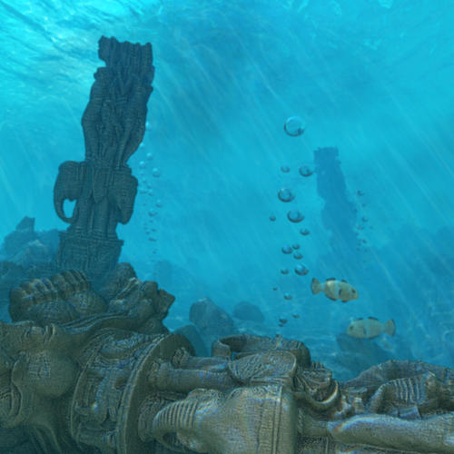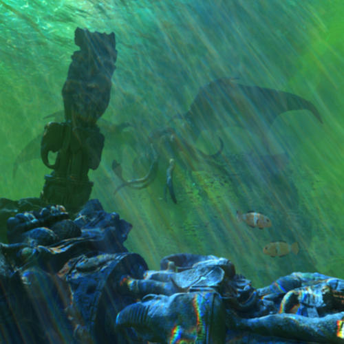 Speaking of which, that second underwater scene is, in my opinion, even better than the first. And here's more of my don't know how I do it, reasons. First, the foreground statue is more pronounced, giving the viewer a good reference point to come back to. It also, once again, guides the viewers' eye further out into the haze, making them ask the "what's out there" question. Which is a guide to the furtherest object, back to the nearest, and to the foreground. While the eye may explore the above, far out, side to side, the eye will always come back to the object in the foreground in order to further study that object.