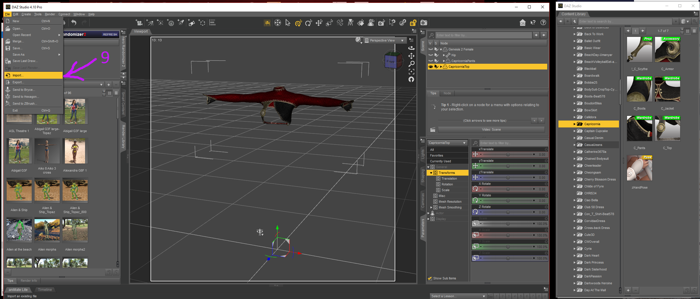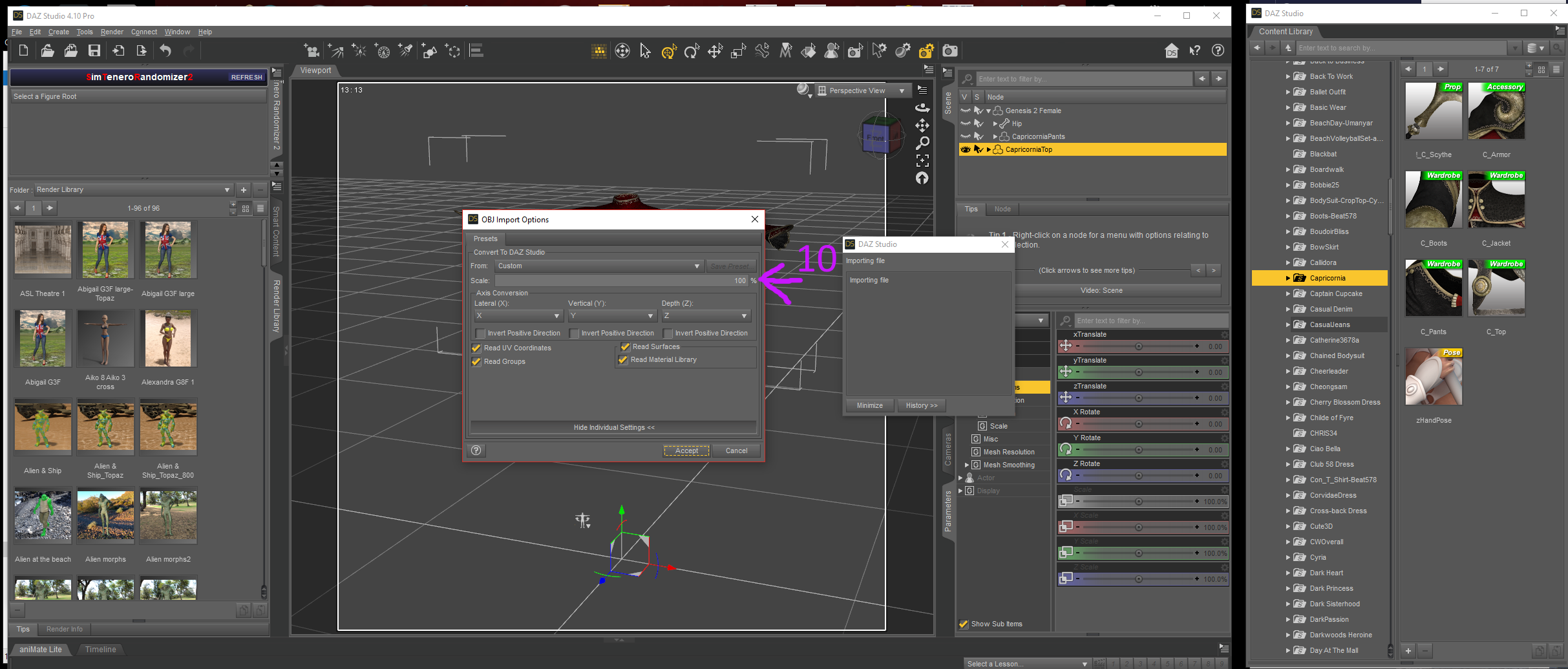 As per suggestions, I loaded the Girl 6 in the plugin, Daz Studio. I conformed the Capricornia scifi outfit. I saved Girl 6 and the outfit out as a scene subset. In Carrara, I tried loading the scene subset. I got a whole string of dsf errors about not finding morphs. A figure with clothes loaded anyway. A second warning displayed (nil pointer). However, the figure did not appear to have Girl 6 morphs applied even though the Girl 6 morph dials can be seen to be set to 1. As a check, I started a new scene and loaded The Girl 6 directly from my content folder. Loaded fine. Basicwear clothes loaded and conformed fine to The Girl 6.
