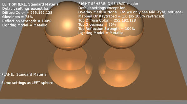 And a screenshot (or actually a couple of screenshots combined) of a DS4.6 render of a scene with just a sphere primitive using this modified DMS (Full) shader. I modified the reflection strengths and colours from the Parameters tab, and also applied a checkerboard mask. The relection you see is the default reflection map included in the shader - the colouration is from those new "Base/Top Reflection Colour" parameters.