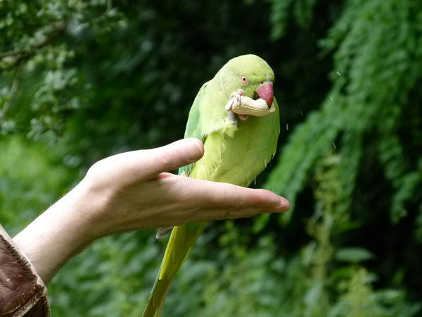 Once again, my right hand appears in this thread; this time accompanied by a wild parakeet. I know, I know, he doesn't look very wild, but you should have heard him scream at the other birds that dared to come near my hand while he was eating...