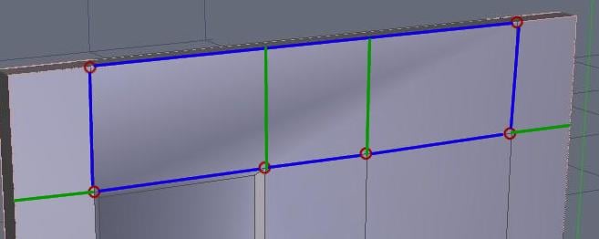 Next I used Tessellate by Slice from top edge to bottom edge, and set that line to be 10cm (4") in from the left edge. I then Tessellated by Slice again, and set that line to be 10cm in from the right edge. Those marked the left and right side 'beams' (see DoorStepTwo, below). At that point I made the mistake of deleting the (now) three top and three bottom faces, and using Close to make a single top and single bottom face. This time I'm leaving the 'extra' faces on the top and bottom faces.