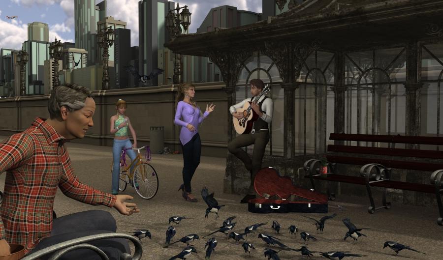 The scene is looking great but your figures all feel a little clustered together and the rest of the city is empty.