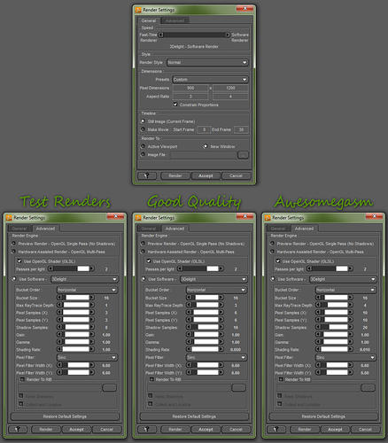 Hey there, I've been here for a couple years, but recently I've been wanting to do more/better renders! Someone posted some really awesome render settings, really put some detail into the render. Unfortunately, I was silly and didn't save suck settings, and now (for the life of me) can't remember where I found it. SOOOO, I'm looking for some suggestions for settings! :)