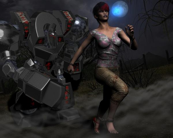 Used Hunter's Moon for the backdrop and ground, Fog Tool 3 for the ground fog, and the shackles on her wrists and ankle are from Shackles of the Inquisition. The shaders were a bit tougher, but there were some fabrics in there; used the pink camo for her shirt, then applied various metals to this guy: http://www.daz3d.com/shop/rock-golem keeping only his glowy runes, and reducing his size to 75% to fit him in the scene.
