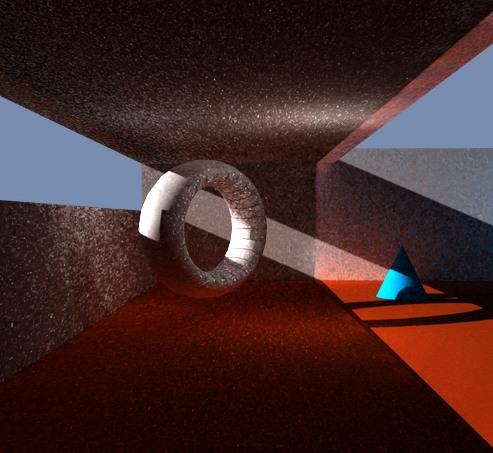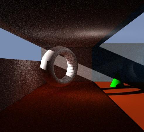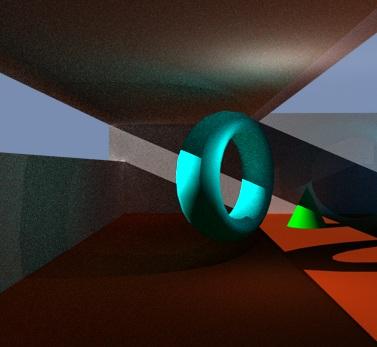 Test images. Boxes, torus, and cone with a glass plane to the right of the torus. One photon mapped distant light and one photon mapped point light.