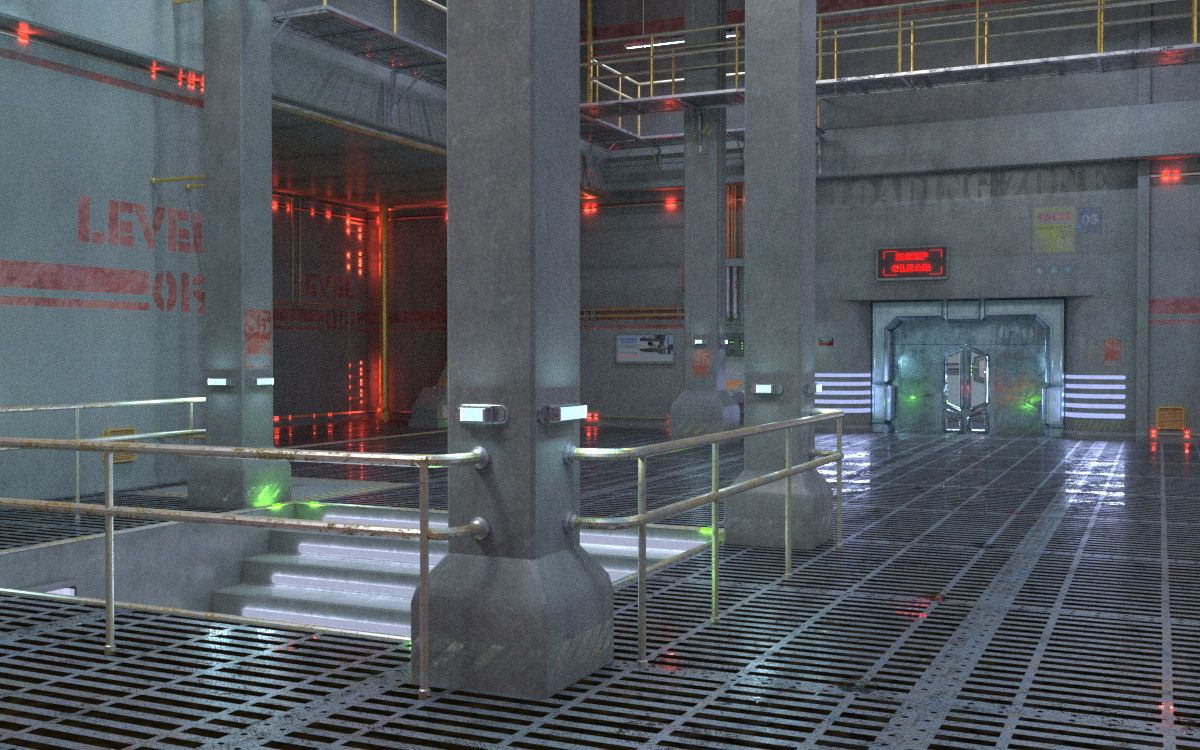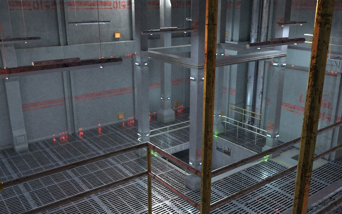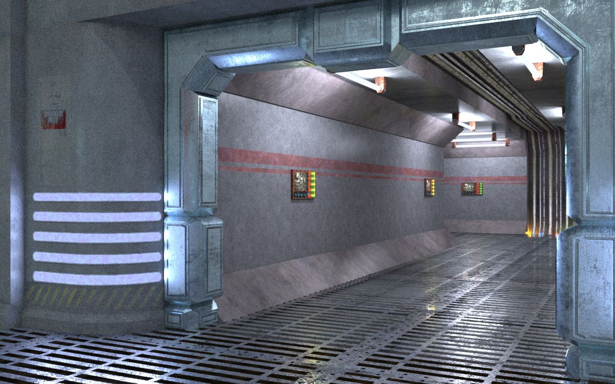 This shot shows both of the doorsets. The doors on the left have a solid wall slab behind them, so I made a billboard to slip in just behind the doors; the billboard uses LightPath ambient boost and actually casts light into the Level 19 main room!
