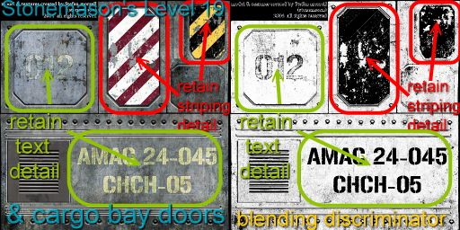 Level 19 has those P4-style texture maps which lose detail and look blurry if you're up close. To give it fine detail yet retain your stenciled markings, I made discriminator maps to control the replacement of the original P4-esque texture with my own non-repeating tiled material. This pic shows a texture map (left) with a discriminator (right).