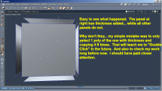 Pic 2 I've hidden the frame to show only the panels and discover the error I made 5 times. Instead of Double Clicking on my panel which I Added Thickness to I only Single Clicked on it and made all the copies from 1 poly. I thought nothing of it at the time as they should all be copies of my thick panel which didn't require a need to pay attention to having Faces facing outwards, or rather towards the camera, since adding thickness creates all faces in correct directions.