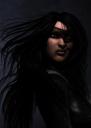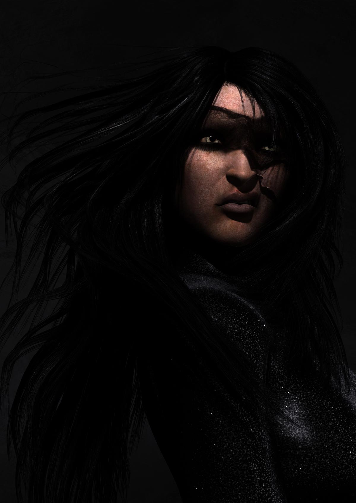 @Barbult  That thing on the side of her face is part of the scarring on that is around her eyes.  I may have to rotate her a little to show that off a little more and make it more recognizable as a scar. And, I was going for dark and mysterious, so that's good!  :)