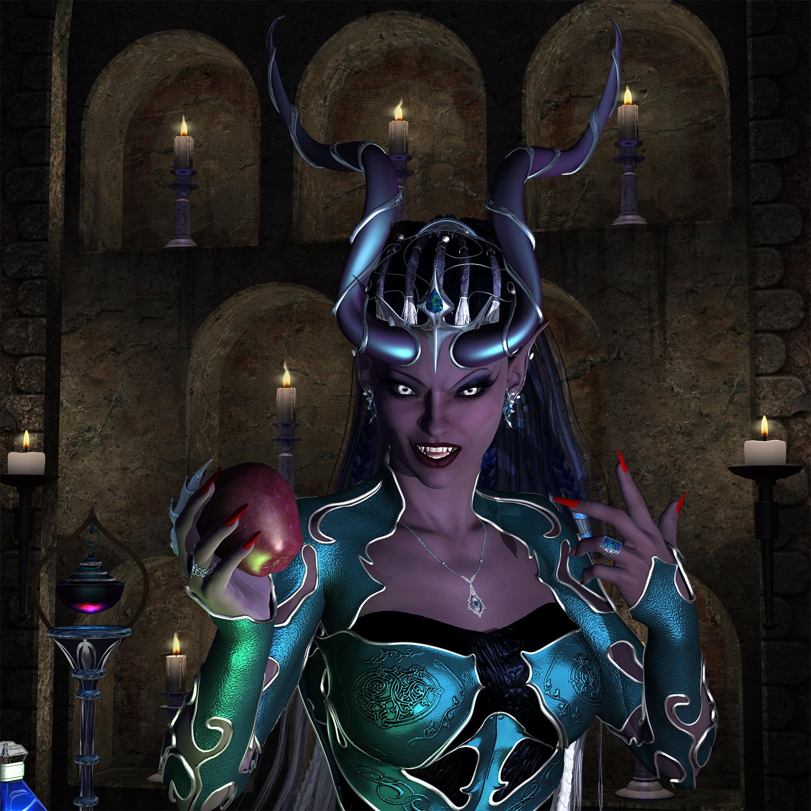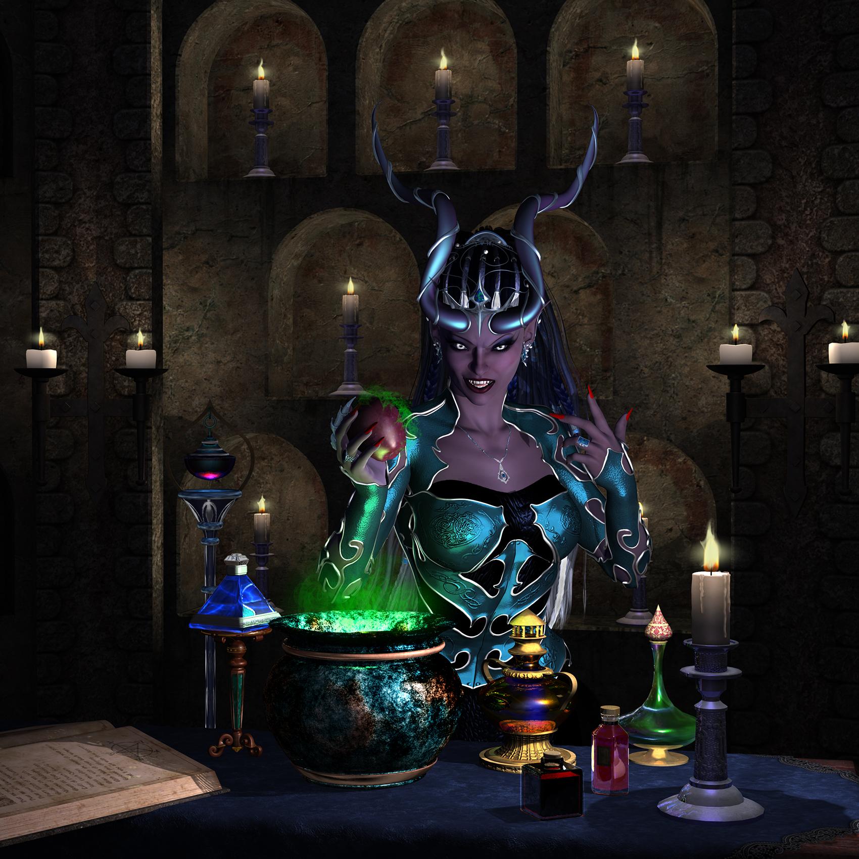 I need an opinion here.  I made two renders, one close up, and one full scene to include the cauldron and various props with a little post work to add the green magic and a little more luminescence to the candles.  The close up was rendered with Victoria 6's HD, and the full scale does not have it.  I didn't add the green magic to the close up, because without the cauldron, it would have been strange to give her a green glowing elbow.  Both files are close to 2 MB so you can zoom in if you open the thumbnails.