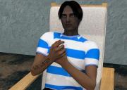 Nice tattoo. Oddly, I can see his face better in the icon then on the big picture. I'm not sure if that's a property of my monitor or what or if you adding a another lightsource, like a point light acting as lamp to light his face from the side would then make too much light.
