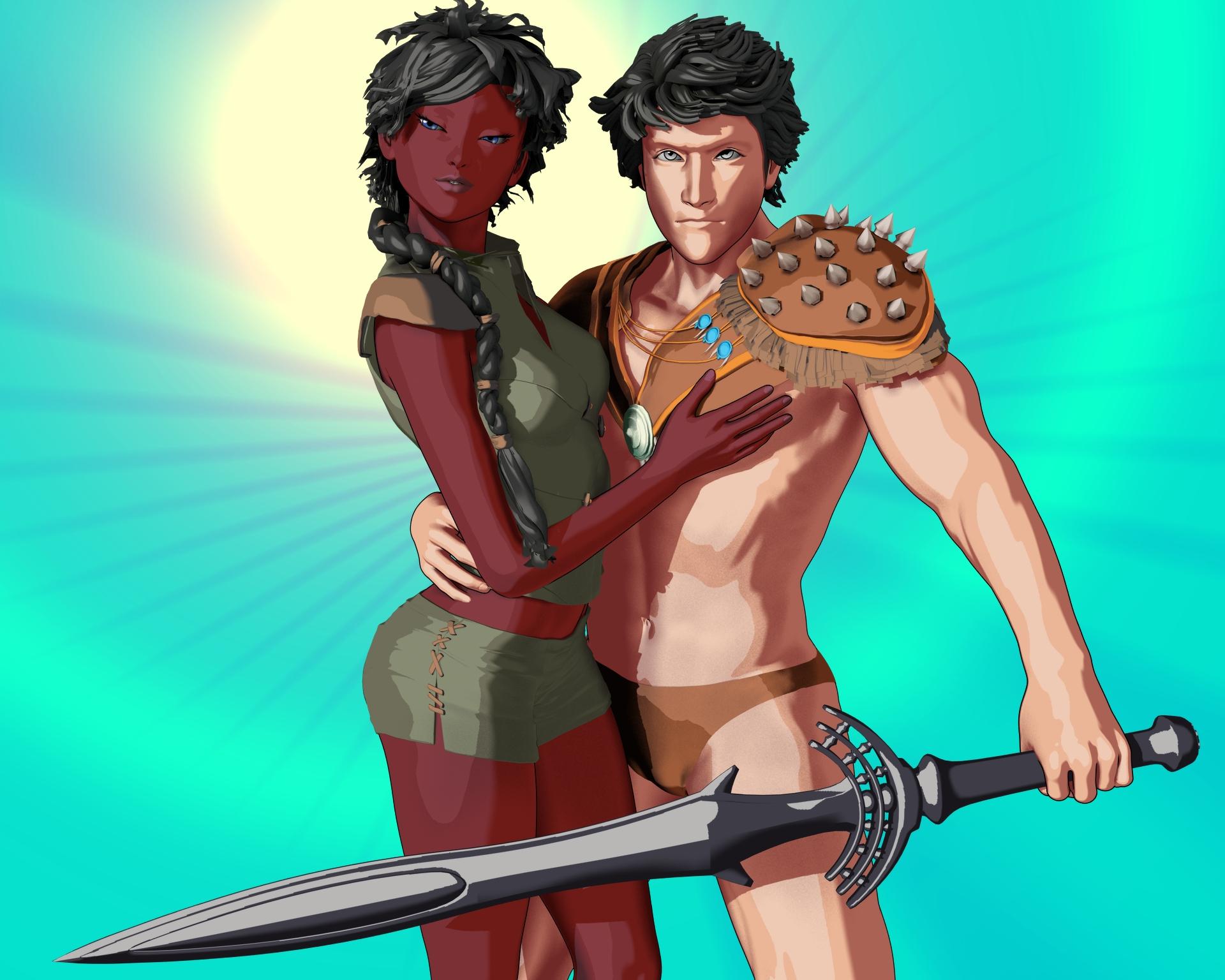 Well I like the image but I'd try to make the sword look more silvery, and shrink the thing on the barbarian's shoulder if not remove it.. Maybe I'd give the female light green, orange-brown or yellow-brown eyes if you can find the right shade but the blue ones look good too.