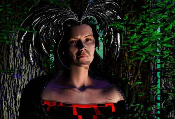 The second one uses the forest tree trunks I learned and the feather mask for M4 not V4. The dress is Amaree and the shawl is the feather shawl from Rdna. I particularly liked the leaf shadows falling on her face. I guess the trunk texture is a bit harsh but I kind of liked the way the feathers and trunks sort of merge, maybe that's just in my imagination.
