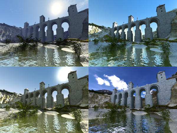 Top right, my first attempt at relighting with a mixture of "obscure" light and Bryce sun.