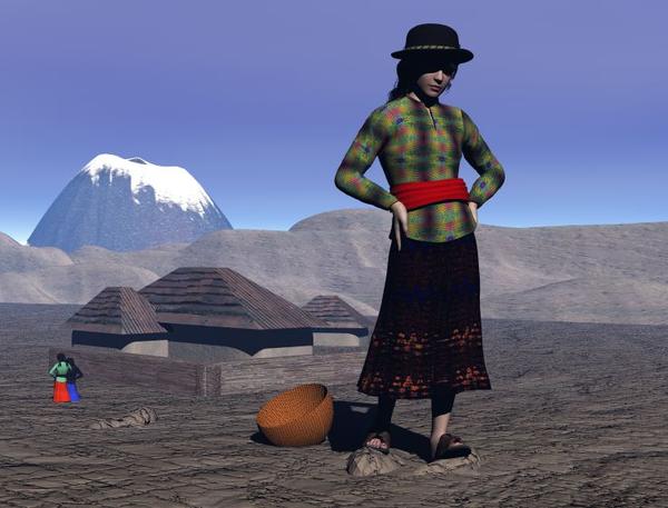 Sheesh, more fantastic renders! while I was repairing mine per David B's suggestion. First of all, I've had to change the subject of #3 from Mayan to Andean, for it to make sense. So I've added the felt hat. I did check some photos on line of the Alto Plano and the volcano/es are very conical with some sandy looking foothills. I removed the pots and cropped to get rid of non-essential space. I adjusted the main girl's stance and added some smaller figures near the buildings. The hat covers her eyes, but this is not a portrait, more of a "tourist snapshot". Hat credit is StudioArtvartarian hat freebies 'caberet' style. The hills and volcano are moved back and set to distance blur as is the ground plane. Not high art, but I hope it reads better.