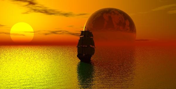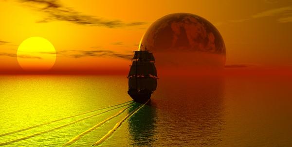 @canyon: Sailing off into the sunset, on another planet, looks really nice. I only wonder if the haze shouldn't be darker below the planet and lighter where the sun shines through. Still, I do like it.