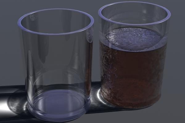 For the water glass I'd say you should place a torus around the lip of the glass to make it appear more drinkable like a rounded edge. Also, the liquid in the glass on the right needs to have it's bump limited only to the top. Change the mapping mode to World Top or Object Top so that there are no ripples along the vertical sides of the glass.
