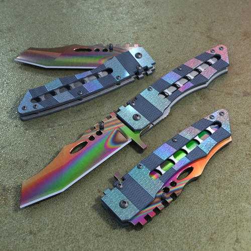 Interesting materials: the one looking like there is an oil spill on the blade's surface, and the second a bit like holographic.