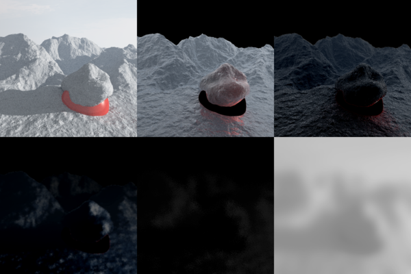 While compositing of refraction I took advantage of angle incidence thinking 'snow should be thinner and more translucent near the edges'. Reflection channel has already angle incidence baked in via metallicity setting (but it's not suitable way of generating it for anything else other than reflection). For other uses angle incidence channel = white diffuse material + point light with no attenuation at the location of camera.