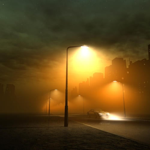 Bryce 15 minute lighting project - low pressure sodium lights on a foggy night - by David Brinnen