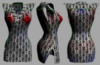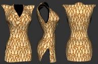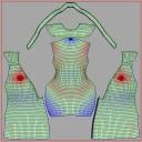 Here is the second re-mapping. I cut the islands to resemble real world clothing patterns. The creator did not design it with realistic seam lines in mind, so I cut in edge loops at the sides. Wings 3D for initial unwrapping. Roadkill for final flattening. It does have some issues I was not happy with (hence the third re-map).