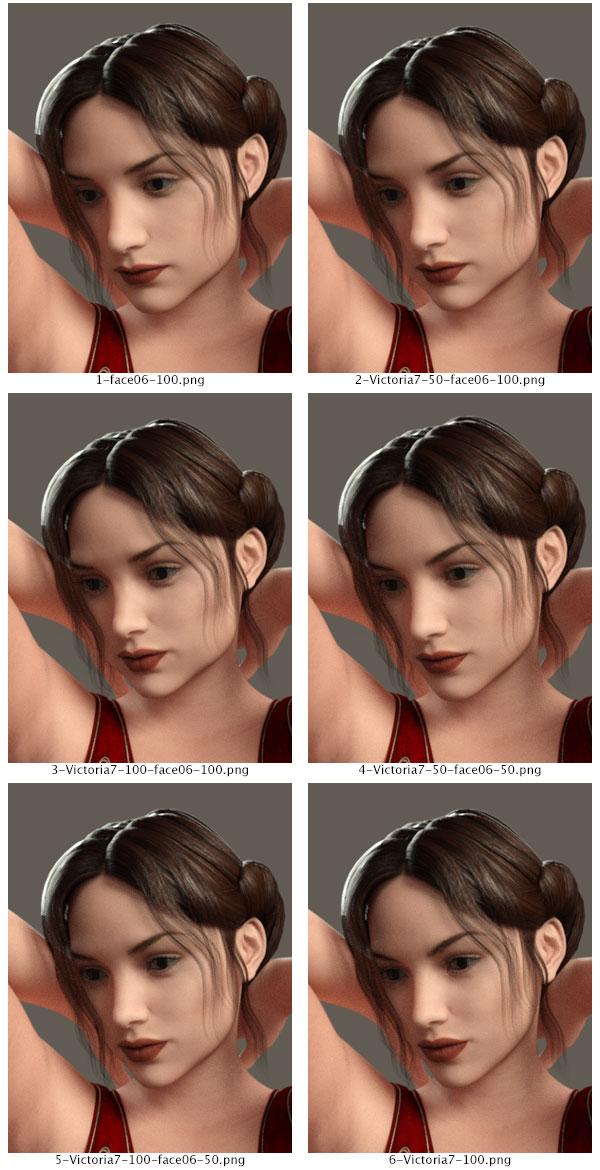 I hope to show further uses of the morphs.  This one is showing mixtures of the Head 06 and Victoria 7 morphs.  I will do some with Eva and will also include how the bodies mix later, as well.