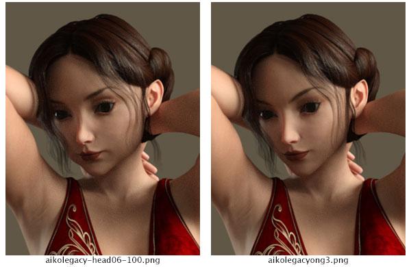 Here's another example of mixing.  Slosh has Legacy Shapes coming for G3 and I'm lucky enough to be trying them out.  I have Aiko on G3, her head and body dialed in.  BTW, I'm also using Slosh's UHT hair shader on the Thalia hair (and all the hair I use in my images at this time).  The previous examples of Vicky/Metamorphosis blending had the Painter Lights, but the backlight was too harsh.  I've adjusted it in this scene, with Aiko, with remarkable results for the hair render.  In addition, on this Aiko example, I've utilized Zilvergrafix's skin shader over the Carmilla skin.  This shows Aiko in default and with the Head 06 added.