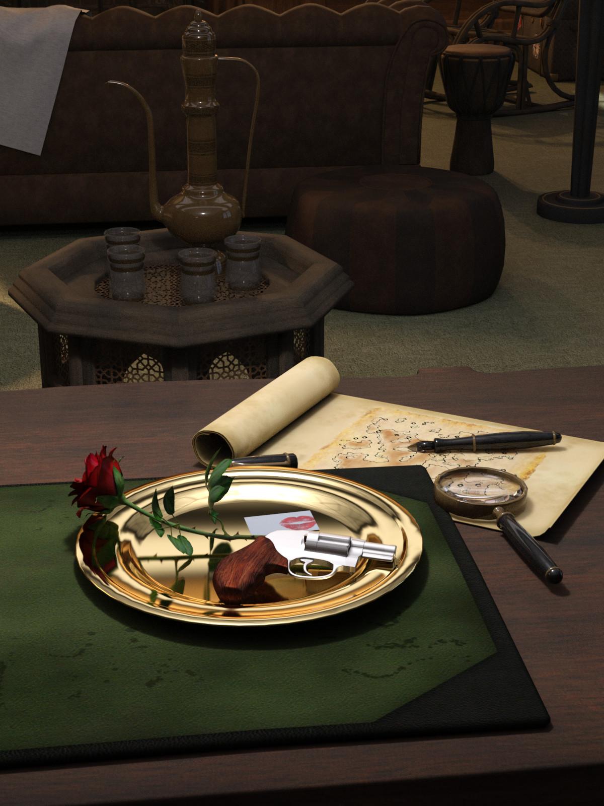 I'll give that a try. Yes, it is Iray. I'll play with the DOF. That actually might help with the text standing out in the version without the fancy parchment overlay, too. It is a cool technique to use, but I think the overlay technique has been a bit overdone myself. It seems like almost every book has that done these days. I'll try some bullets, but I haven't been happy with the bullets I have in my library at the moment. I don't know if it is the shader or the modeling, but they just don't look realistic enough. I just got more shaders that I can try out, though, and see if any of them make a difference.