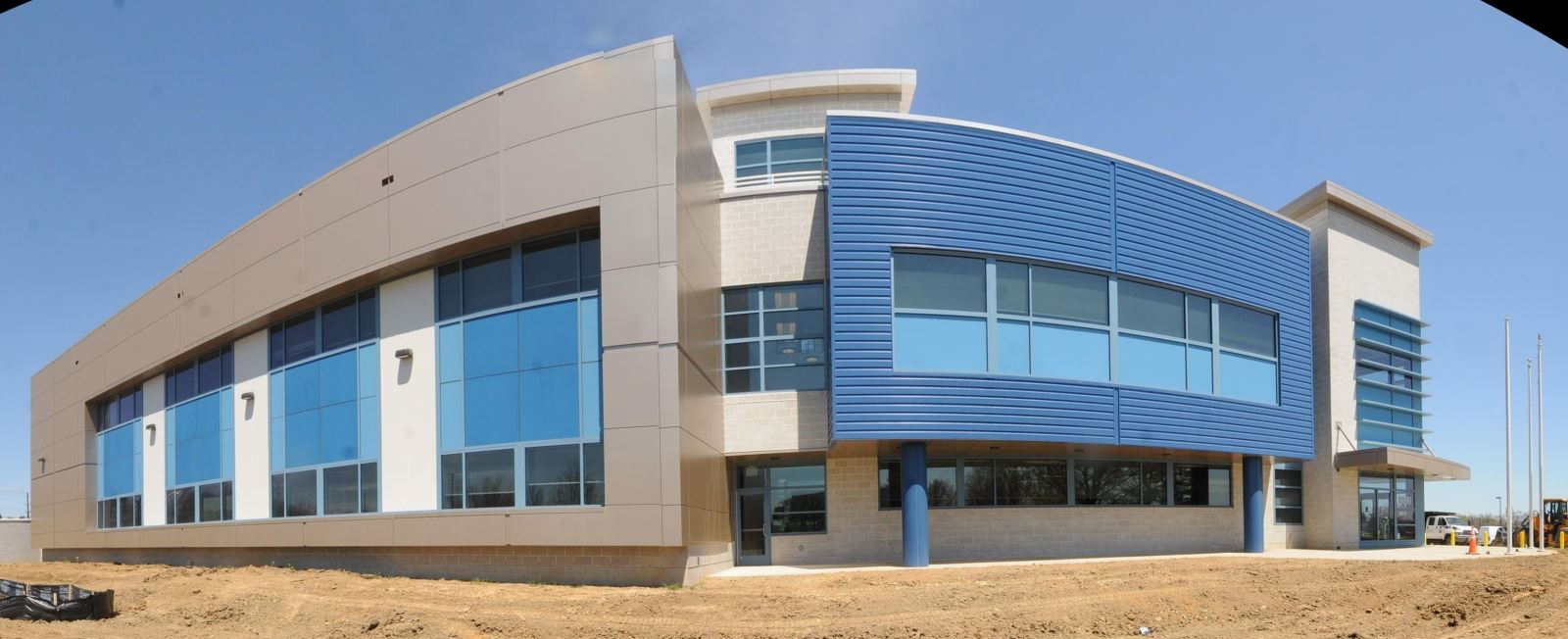 This is from the side of the corner across the street from the building, and shows most of the building. The P.D. entrance isn't visible in this photo :